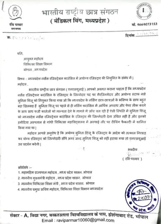 आपको बता दें, सुनीता शिजू वर्तमान में दतिया मेडिकल कॉलेज में स्टॉफ नर्स के पद पर पदस्थ थीं। घोटाला सामने आने के बाद उनका ट्रांसफर दतिया किया गया था। इससे पहले वे गांधी मेडिकल कॉलेज में स्टॉफ नर्स रहीं हैं। जहां से उन्हें प्रतिनियुक्ति पर मप्र नर्सिंग रजिस्ट्रेशन काउंसिल लाया गया था। बाद में उन्हें रजिस्टार बनाया था। एनएसयूआई नेता रवि परमार ने बताया, जब रजिस्ट्रार बनाया गया था तब भी हमने विरोध किया था। लेकिन, किसी ने ध्यान नहीं दिया। अब नर्सिंग कॉलेज घोटाले की परत दर परत खुल रही है। ऐसे में सुनीता शिजू को बर्खास्त करना काफी नहीं है, उन पर कानूनी कार्रवाई भी होना चाहिए।