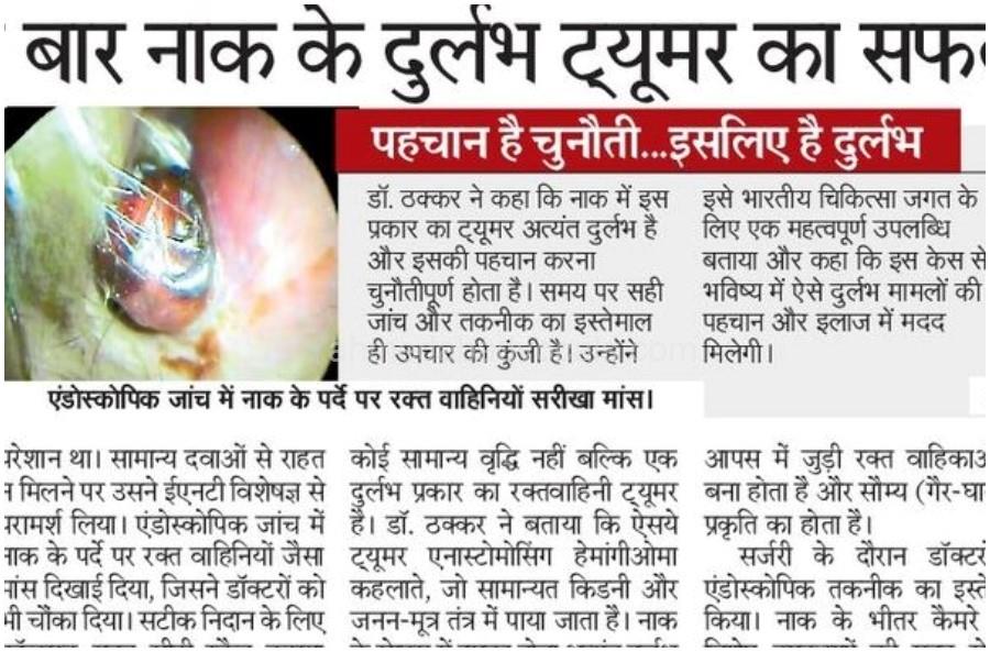 डॉ. ठक्कर के अनुसार, इस ट्यूमर को एनास्टोमोसिंग हेमांगीओमा कहा जाता है। आम तौर पर यह किडनी या जनन-मूत्र तंत्र में मिलता है, इसलिए नाक के सेप्टम में इसका मिलना बेहद असामान्य है। यह सौम्य यानी गैर-घातक होता है, लेकिन इसकी बनावट और लोकेशन इसे पहचानने में मुश्किल पैदा करती है। मरीज का ऑपरेशन एंडोस्कोपिक तकनीक से किया गया जिसमें नाक के भीतर कैमरे और विशेष उपकरणों की मदद से ट्यूमर को अत्यंत कम रक्तस्राव के साथ सफलतापूर्वक हटा दिया गया। बायोप्सी ने भी पुष्टि कर दी कि यह एनास्टोमोसिंग हेमांगीओमा ही था। सर्जरी के बाद मरीज सामान्य देखभाल से जल्दी ठीक हो गया और करीब 20 दिन बाद फॉलो-अप में पूरी तरह स्वस्थ पाया गया।