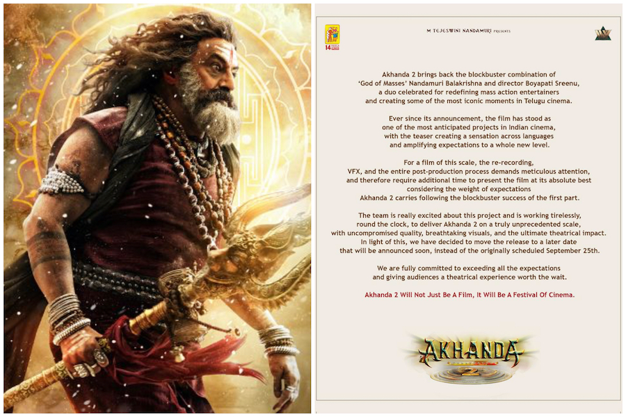 नंदमुरी बालकृष्ण ने आज अपने सोशल मीडिया पर एक पोस्ट शेयर किया जो कि फिल्म के निर्माताओं ने लिखा है। उन्होंने इस नोट में लिखा, नंदमुरीबालकृष्ण की 'अखंडा 2' को और बेहतर बनाने के लिए री-रिकॉर्डिंग, वीएफएक्स और पोस्ट-प्रोडक्शन के लिए और समय चाहते हैं। नई रिलीजतारीख बाद में बताई जाएगी। यह खबर बालकृष्ण के प्रशंसकों के लिए निराशाजनक है, जो इस एक्शन फिल्म की रिलीज का बेसब्री से इंतजार कररहे हैं।