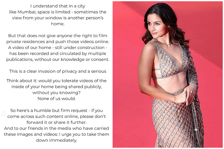 आलिया भट्ट ने इस पोस्ट में लिखा, “मैं समझती हूं कि मुंबई जैसे शहर में जगह कम हैं, कभी-कभी आपकी खिड़की से किसी और के घर का नजारादिखता है. लेकिन, इसका मतलब यह नहीं कि किसी को किसी के घर का वीडियो बनाकर उसे ऑनलाइन शेयर करने का अधिकार है. हमारा घरनिर्माणाधीन है, हमारी जानकारी या सहमति के बिना कई मीडिया द्वारा उसका वीडियो रिकॉर्ड और प्रसारित किया गया है. यह निजता का स्पष्टउल्लंघन और एक गंभीर सुरक्षा मुद्दा है. बिना अनुमति इस तरह वीडियो बनाना या उसकी तस्वीरें लेना कंटेंट नहीं, सीमा को लांघना है। इसे कभी भीसामान्य नहीं माना जाना चाहिए.”