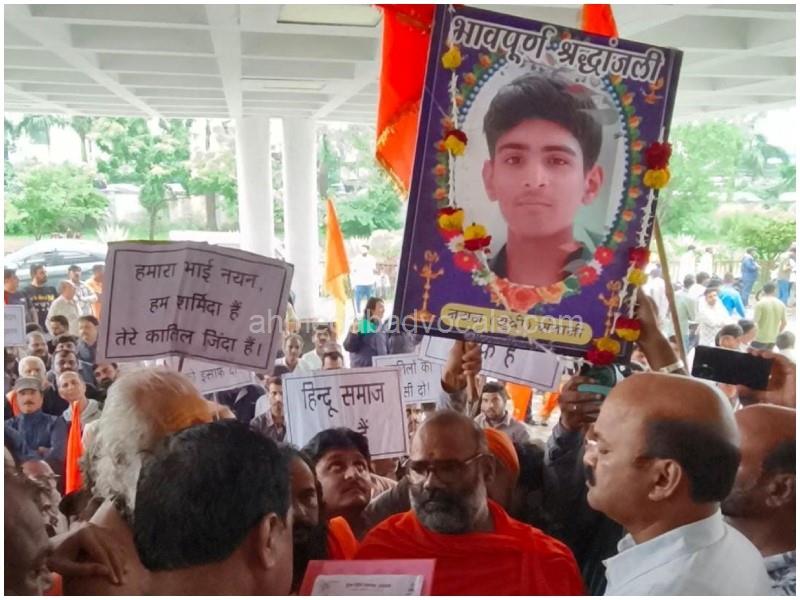 अहमदाबाद न्यूज डेस्क: अहमदाबाद में 14 वर्षीय 10वीं कक्षा के छात्र नयन की चाकू घोंपकर हत्या के विरोध में रतलाम में सिंधी समाज ने मंगलवार को कलेक्ट्रेट पर प्रदर्शन किया। पूज्य सिंधी पंचायत के बैनर तले बड़ी संख्या में समाजजन, साधु-संत और हिंदू संगठन के पदाधिकारी पहुंचे। वे राज्यपाल और मुख्यमंत्री के नाम ज्ञापन सौंपना चाहते थे। कलेक्टर राजेश बाथम जनसुनवाई में होने के कारण थोड़ी देर तक समाजजनों ने बाहर नारेबाजी की, बाद में कलेक्टर आए और ज्ञापन स्वीकार किया गया।