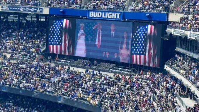 वायरल वीडियो में दिखाया गया है कि ट्रंप अपनी पत्नी मेलानिया का हाथ थामे स्टेडियम में दाखिल होते हैं। जैसे ही वे अपनी सीट पर पहुंचते हैं, जंबोट्रॉन पर उनकी तस्वीर दिखाई जाती है। तब अमेरिका का राष्ट्रगान बजता है, और ट्रंप सम्मानपूर्वक राष्ट्रीय ध्वज ‘स्टार्स एंड स्ट्राइप्स’ को सलामी देते हैं। राष्ट्रगान समाप्त होते ही दर्शकों की ओर से हूटिंग और तालियों की गड़गड़ाहट सुनाई देती है।